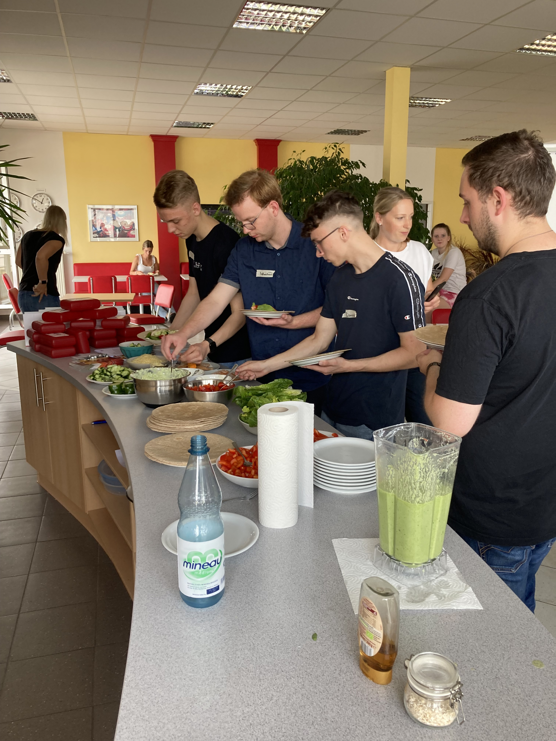 Zur Mittagszeit hat die Ernährungsberaterin Tomma Günther einen Einblick in die gesunde Ernährung gegeben und Tipps für ausgewogene Mahlzeiten im Arbeitsalltag gegeben. Anschließend wurden zusammen mit den Auszubildenden gesunde Snacks für die Mittagspause zubereitet und gemeinsam gegessen.